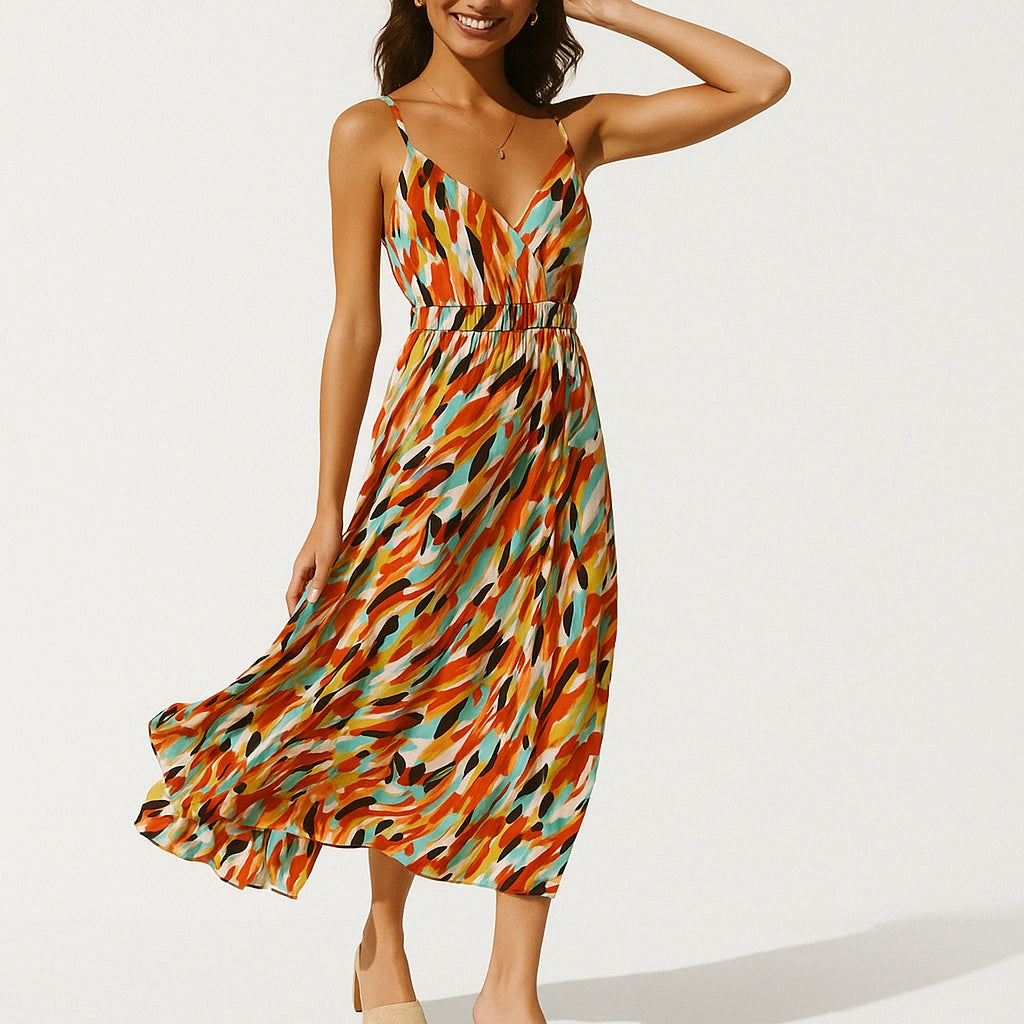 Frederika omslutter dig med frihed og friskhed ved hvert skridt. Den luftige silhuet og det bløde, åndbare stof bevæger sig yndefuldt og giver dig et afslappet, men elegant udtryk – perfekt til solrige dage og lune aftener. Stoffet er blødt og åndbart og sikrer komfort hele dagen. Pasformen er flatterende og flydende, og den følger dine bevægelser naturligt. Det kunstneriske print tilføjer et unikt præg og gør kjolen til noget helt særligt – både til afslappede hverdage og særlige anledninger.