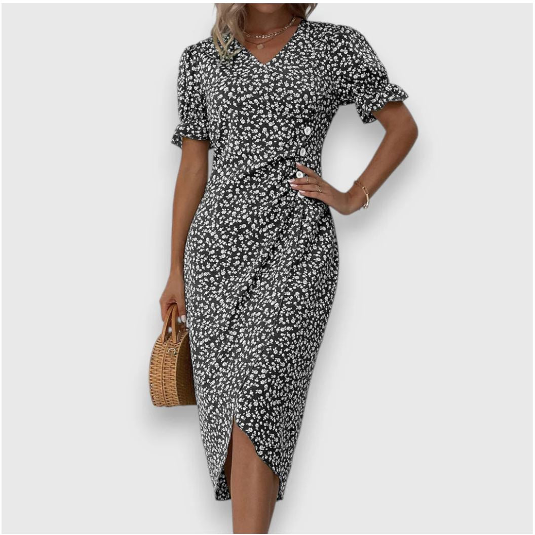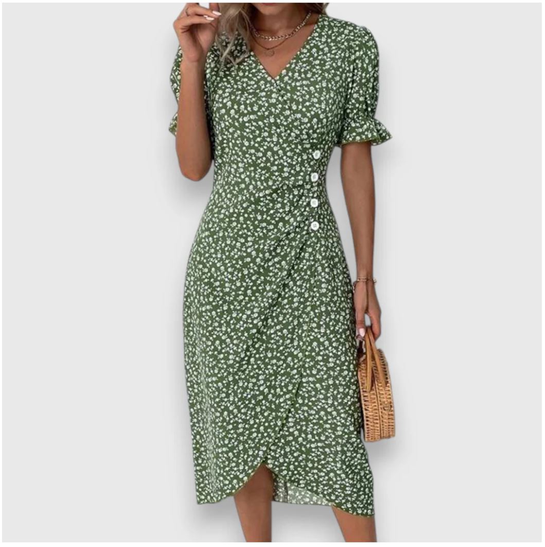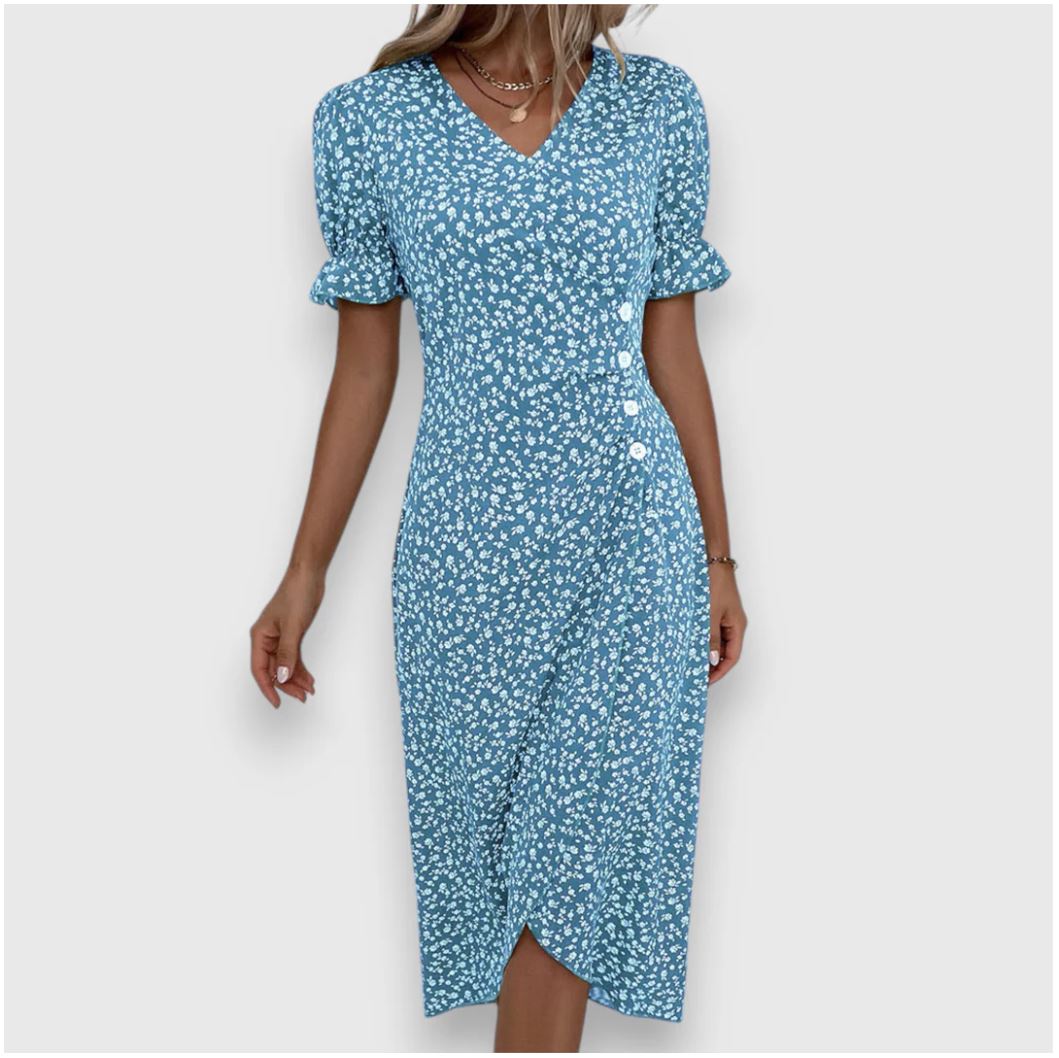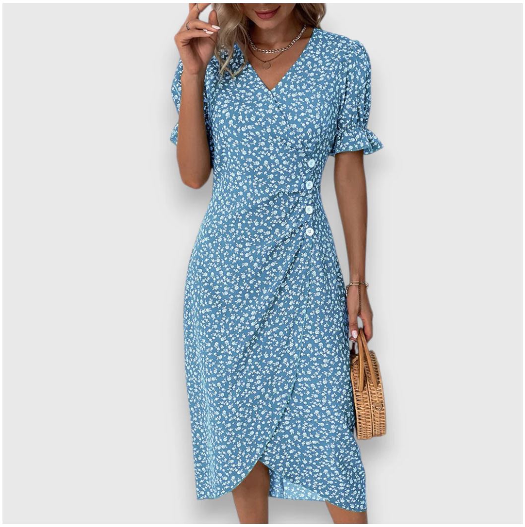 Glid ubesværet gennem dagen i Frederika | blomsterkjole – en blomstrende midikjole, der forener komfort med yndefuld femininitet. Med sin bløde V-udskæring, slå-om-effekt og luftige pasform er den ideel til solrige udflugter, brunchaftaler eller bare til at føle sig let og godt tilpas i hverdagen.